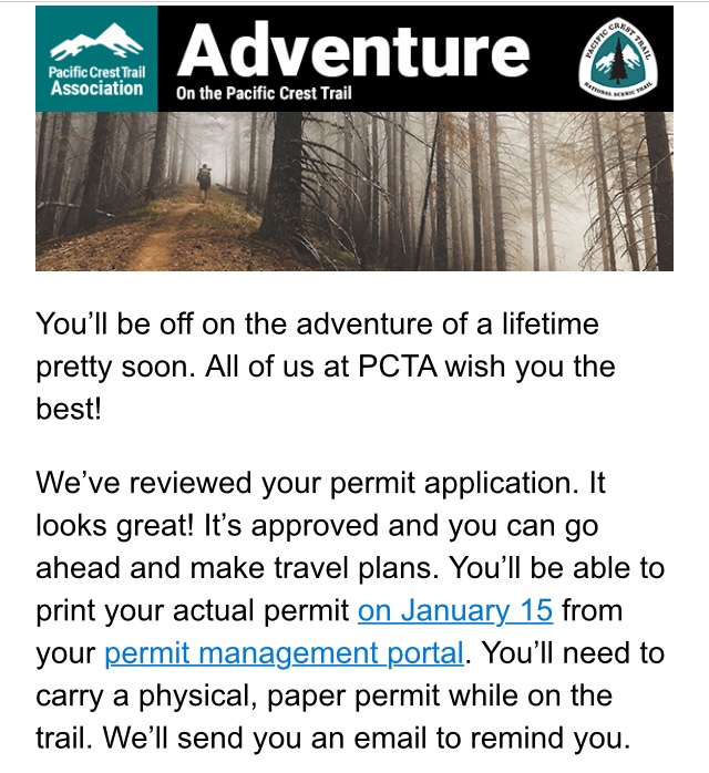 On November 13, 2019 I received an email from the Pacific Crest Trail Association. This email stated that my permit application for my March start date was approved.